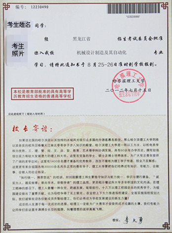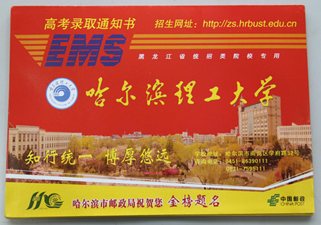 “录取通知书”,既有入学报到的功能,又有收藏纪念的意义,我处精心设计,力求用图案、颜色、风格、文字展示学校发展建设成就。采用黑龙江省统一印制的高考录取通知书专用特快专递(EMS)来邮寄考生的“录取通知书”,并在特快专递的封皮上采用个性化设计,彰显了我校的办学特色。